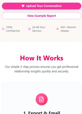 Our simple 3-step process ensures you get professional relationship insights quickly and securely.